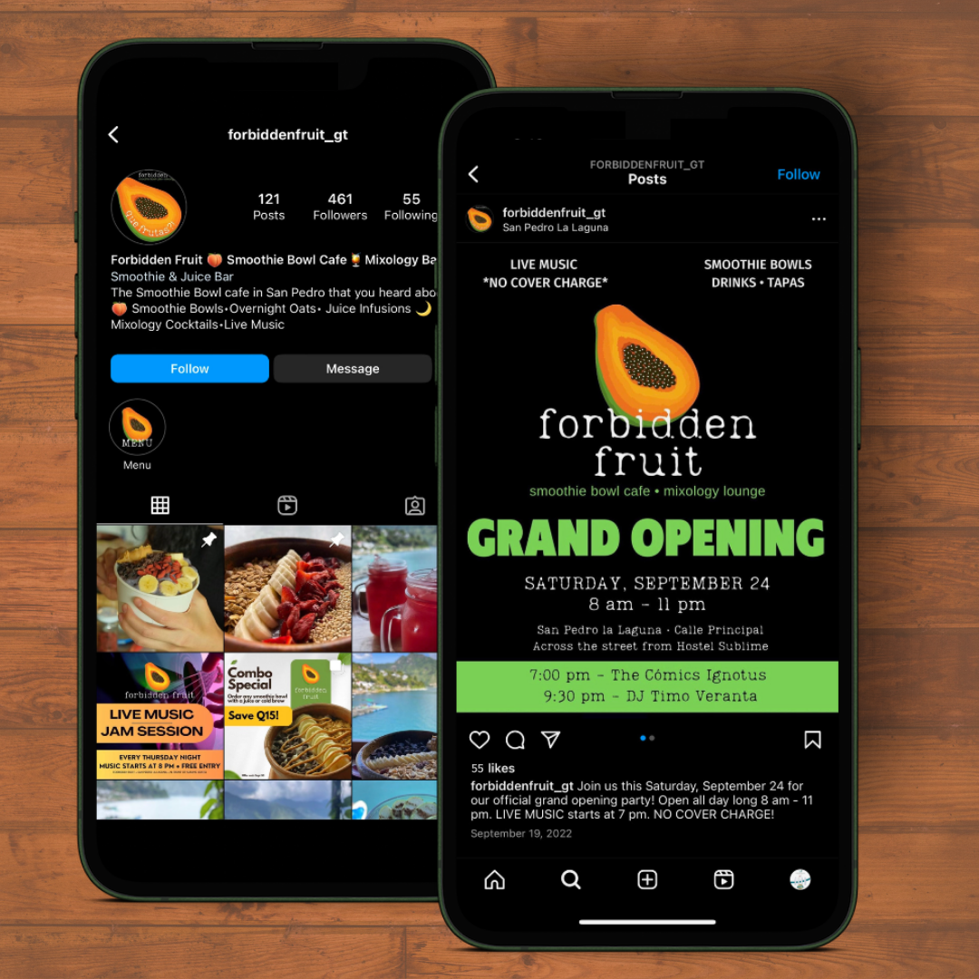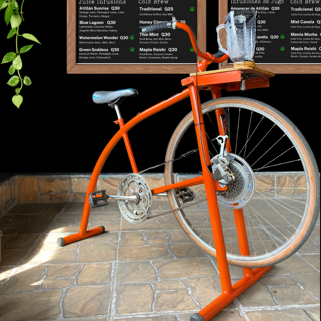 Eco-Friendly Initiative: To further engage with the community, we encouraged Forbidden Fruit to invest in a bicycle blender refurbished by a local non-profit. This human-powered, blender serves as an eco-friendly option for guests to reduce their environmental impact. It also provides the restaurant with the means to stay open during electricity outages, a common occurrence in the small Guatemalan lake town. Beyond the climate-positive impact of the bike, it naturally became an attraction for tourists, earning organic reach beyond measure on social media as a result.